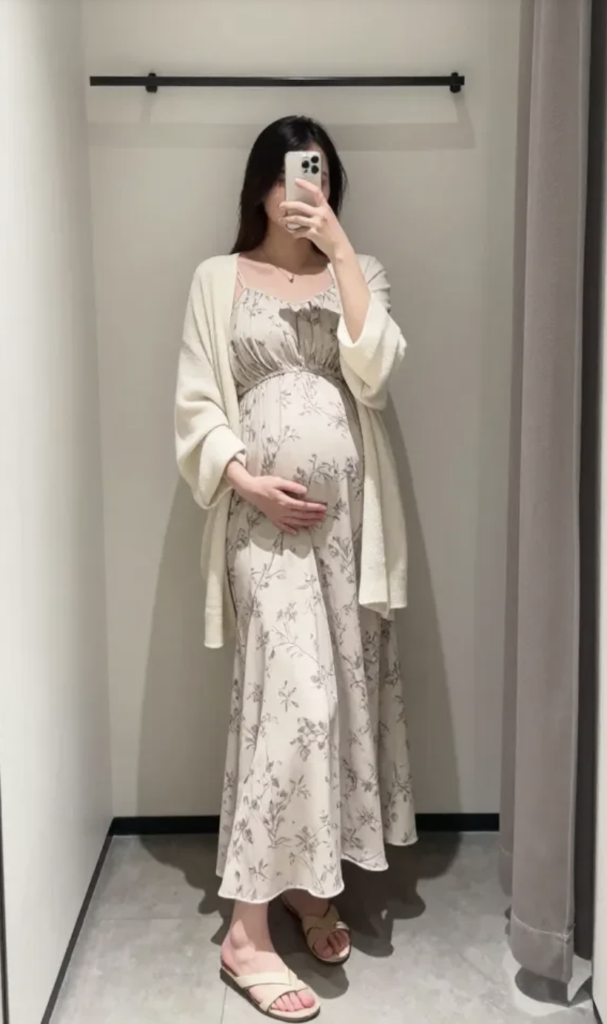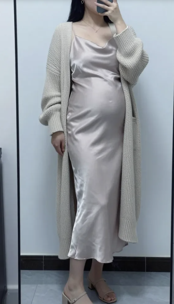 Yes, a slip dress can work during pregnancy—with the right layers. A soft knit overlay adds warmth and coverage while keeping your silhouette airy and chic.