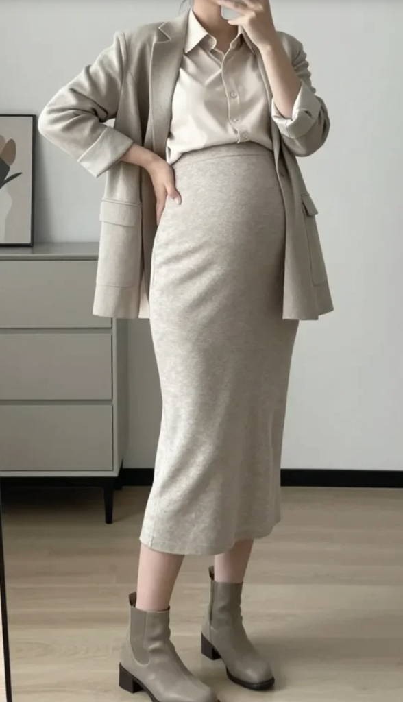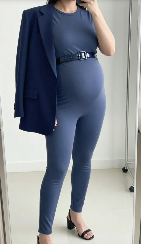 If you’re climbing back to the office or conquering Zoom meetings while growing a baby bump, this look blends professionalism with stretch. The A-line silhouette skims without clinging.
