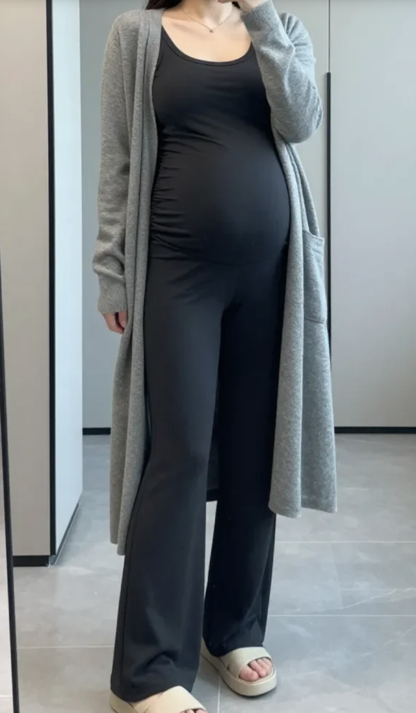 This outfit is the sweet spot between lounge-worthy and wow-worthy. A flowing maxi dress flatters every bump, while a drape cardigan adds polish for date nights, coffee runs, or park strolls.