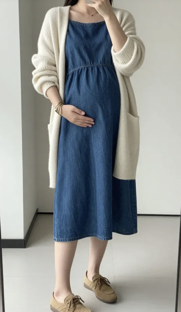5. Denim Maternity Midi Dress + Cozy Cardigan: Effortlessly Everyday