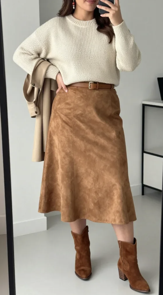 Tuck the front of your sweater into the skirt to define the waist, and let the hem of the skirt swing for movement. A light belt can add polish if you want more structure. If you’re chilly, layer with a longline cardigan or a trench for a polished silhouette.