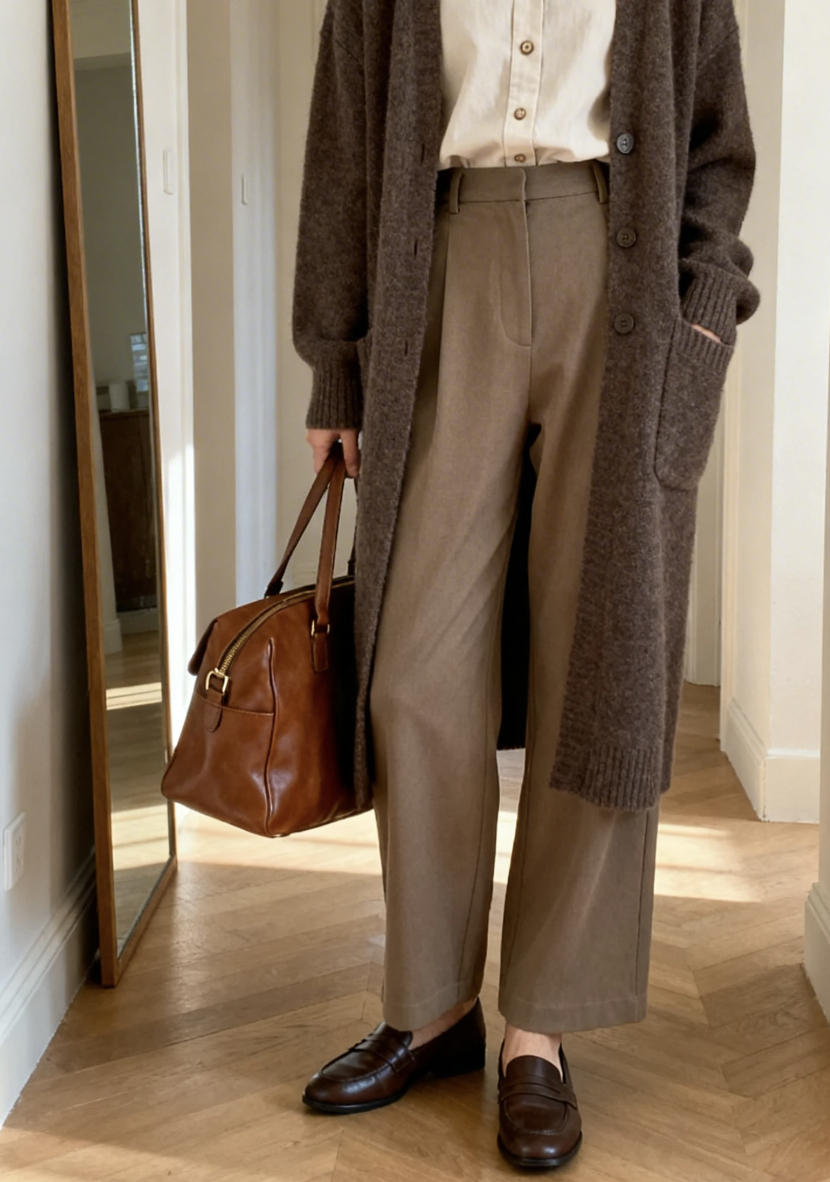 - Wednesday: Cardigan + Wide-Leg Pants (midweek polish).